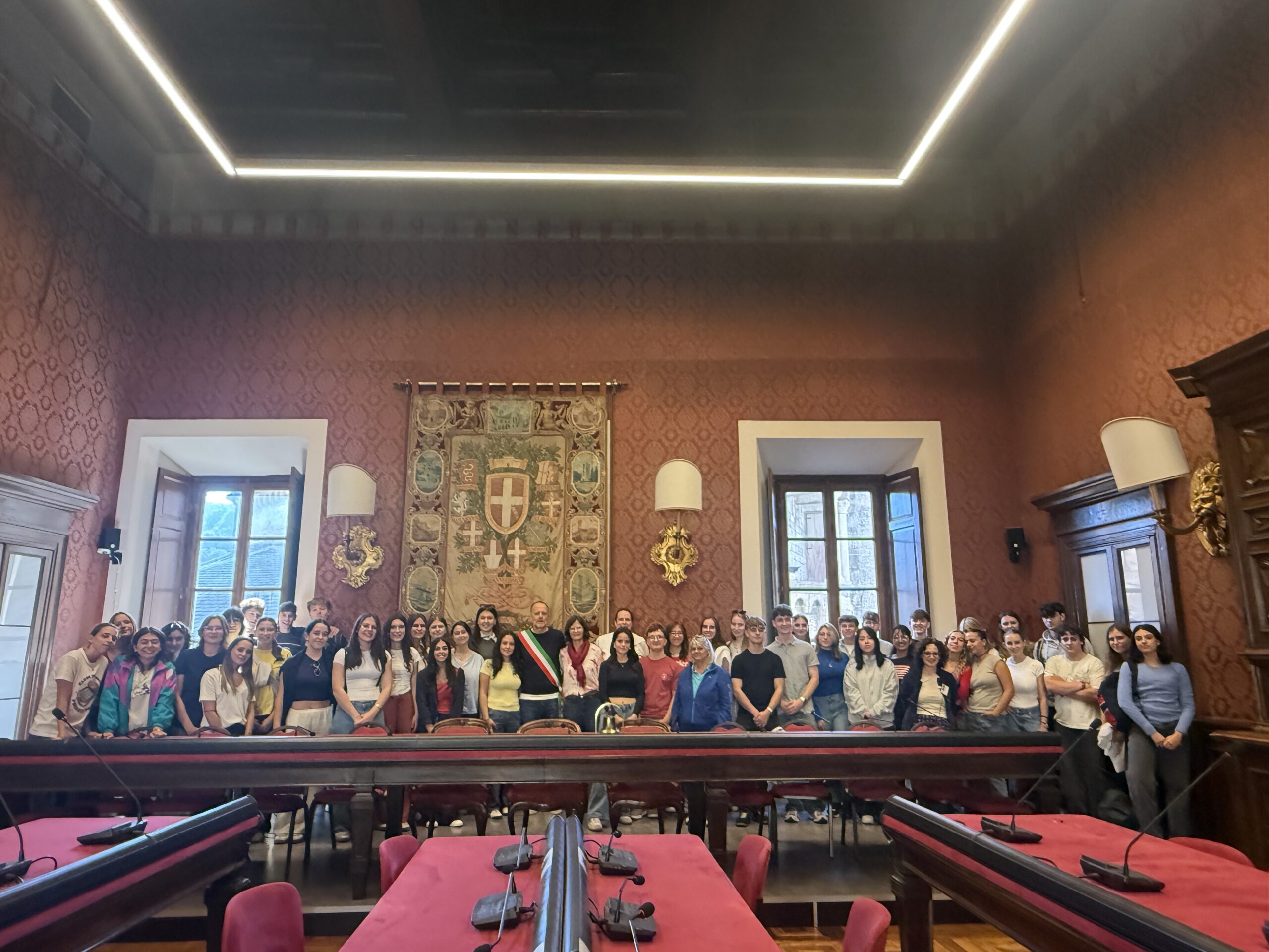 Wer aber dachte, dass er sich am Montag in der Gastfamilie ausruhen konnte, lag falsch. Ein langer Tag stand uns bevor. Um 8:00 Uhr saßen wir in einem Klassenzimmer, das wir auch an den nächsten Tagen aufsuchten. Zunächst stellten uns italienische Schülerinnen und Schüler die Großstadt in einer sehr ansprechenden Präsentation vor. Auch die Direktorin kam kurz vorbei, um uns zu begrüßen und uns viel Spaß zu wünschen. Anschließend hatten wir eine Stunde Unterricht auf Italienisch. Gegen 10:00 Uhr fuhren wir alle zusammen mit unseren Austauschschülern nach Como. Dort angekommen, hatten wir nach ein paar Präsentationen der italienischen Schüler über bedeutende Bauwerke wie die Porta Torre und die Cattedrale di Santa Maria Assunta (Duomo di Como) viel Freizeit, die wir natürlich optimal nutzten. Um 15:00 Uhr trafen wir uns am Rathaus von Como, da nun ein Besuch bei dem Bürgermeister Alessandro Rapinese anstand. Wir durften im Konferenzraum Platz nehmen, während uns der Bürgermeister über die Partnerschaft zwischen Como und Fulda informierte. Abschließend machten wir noch ein gemeinsames Foto, bevor wir wieder entlassen wurden. Jetzt hatten wir wieder etwas Freizeit, bis das Highlight des Tages anstand. Eine Bootstour auf dem Comer See. Eine Stunde lang durften wir den Wind und die beeindruckende Umgebung genießen, während die Sonne langsam unterging. Gegen 19:00 Uhr begann die Rückreise mit dem Bus zum Liceo Classico. In den Gastfamilien wartete ein leckeres Abendessen auf uns und wir fielen alle erschöpft ins Bett. Der erste Tag war wunderbar und ein guter Start in die Woche.